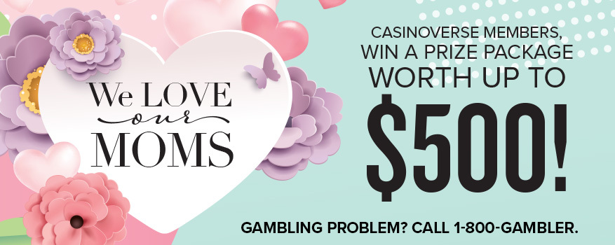 Casinoverse Members, log in daily from Thursday, May 1st – Sunday, May 11th to redeem your FREE online entry from the Hot Picks section of the WStore to be entered in our We Love Our Moms Giveaway Online Drawings happening Sunday, May 11th. You could win a prize package including Hotel, Food Credits, Slot FREE Play, and more!